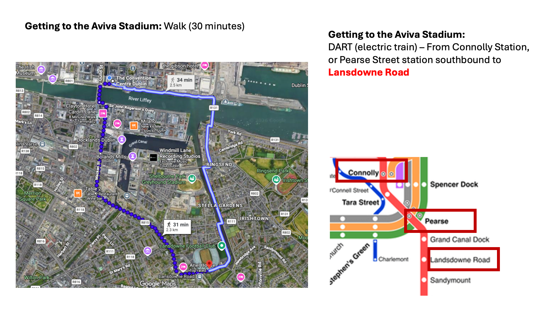 You will be coming in through Entrance A, Lansdowne Road, the Main Reception. Here is the google ping for reference: https://maps.app.goo.gl/52j7STbSczEUXhpF7 (see attached also wayfinder image). The stadium is a 30 minute walk from the centre.